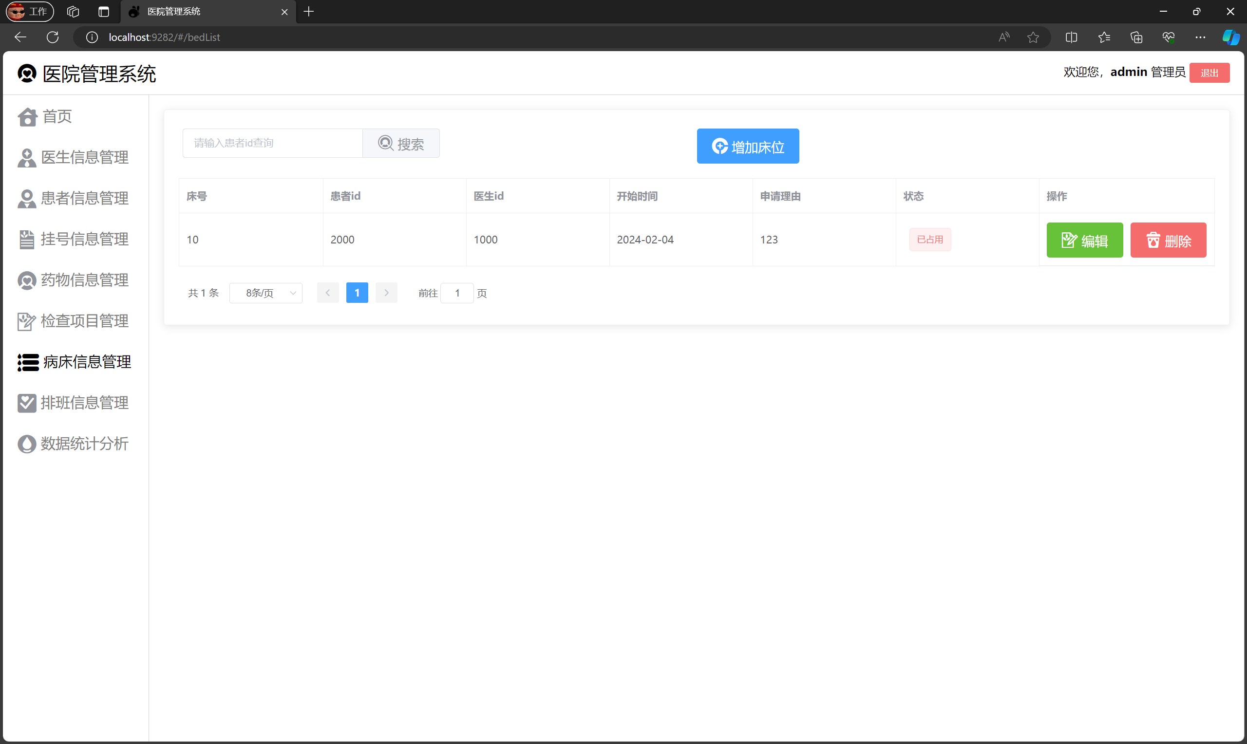 病床管理:可以查看患者与医生编号以及入住时间,同时可查看病床状态。支持新增、编辑、删除功能。