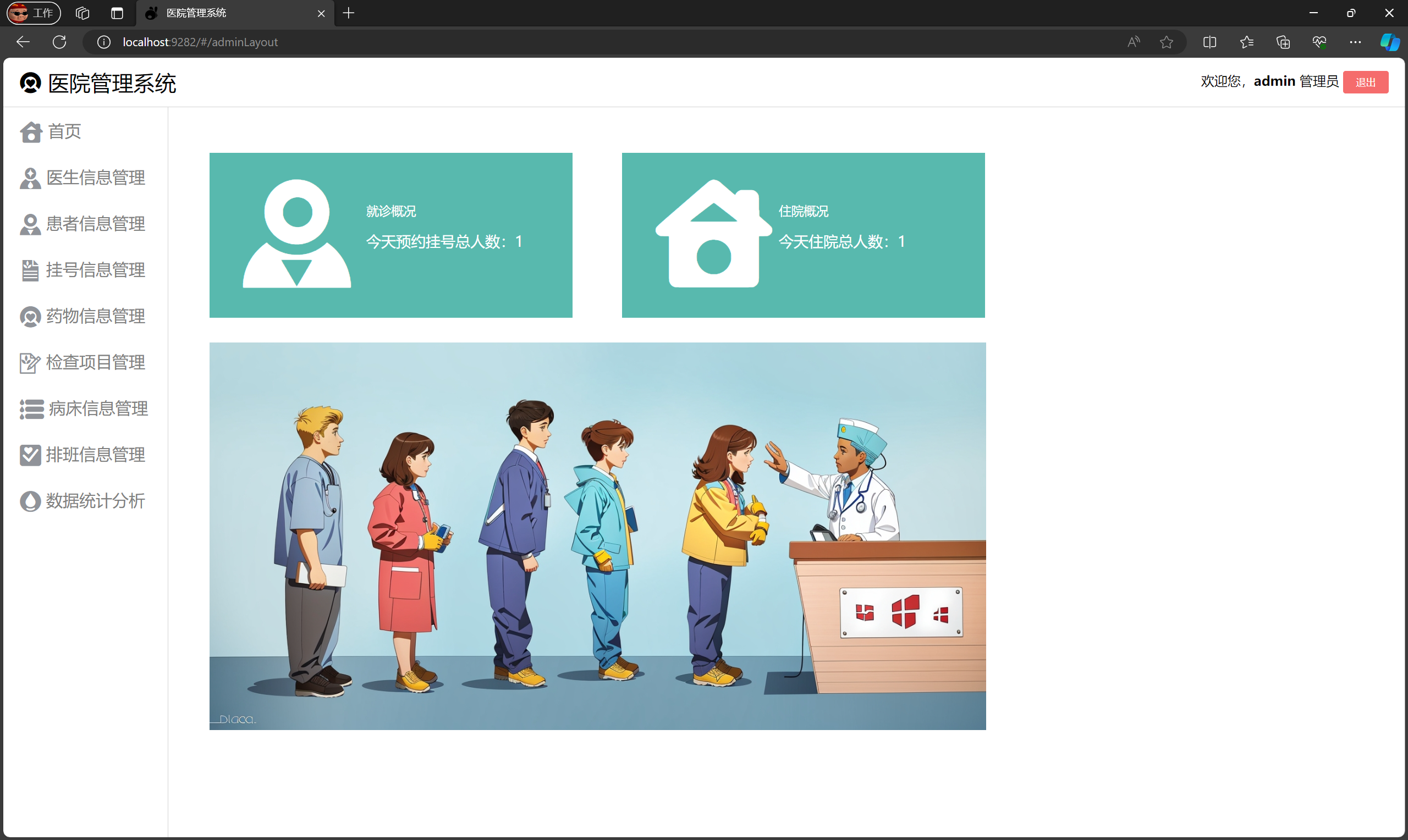 管理员首页:可以看到今天的预约挂号总人数与今天住院总人数。