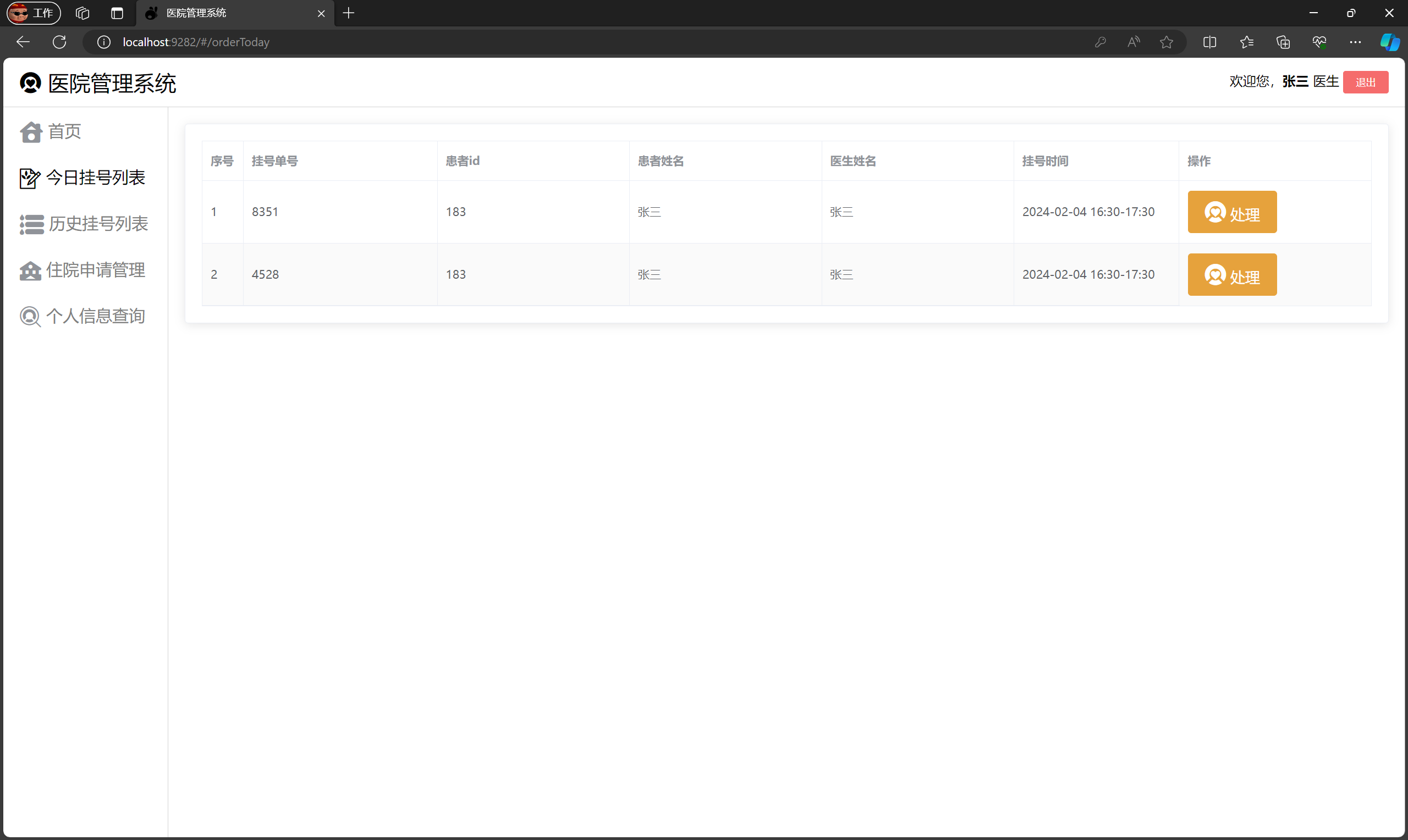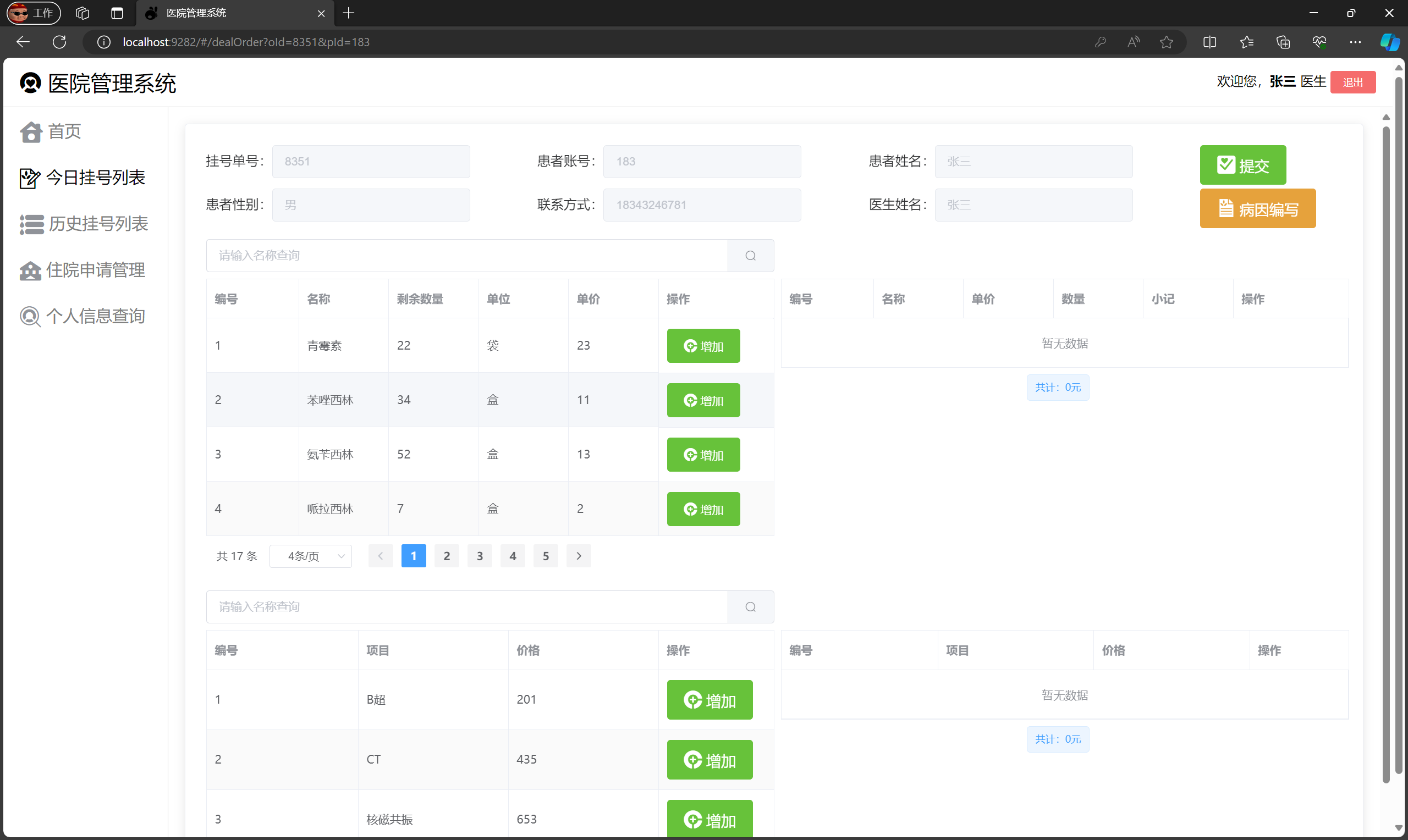 今日挂号列表:医生可以看到自己科室的挂号信息。点击处理可以维护所开的药品以及检查项。