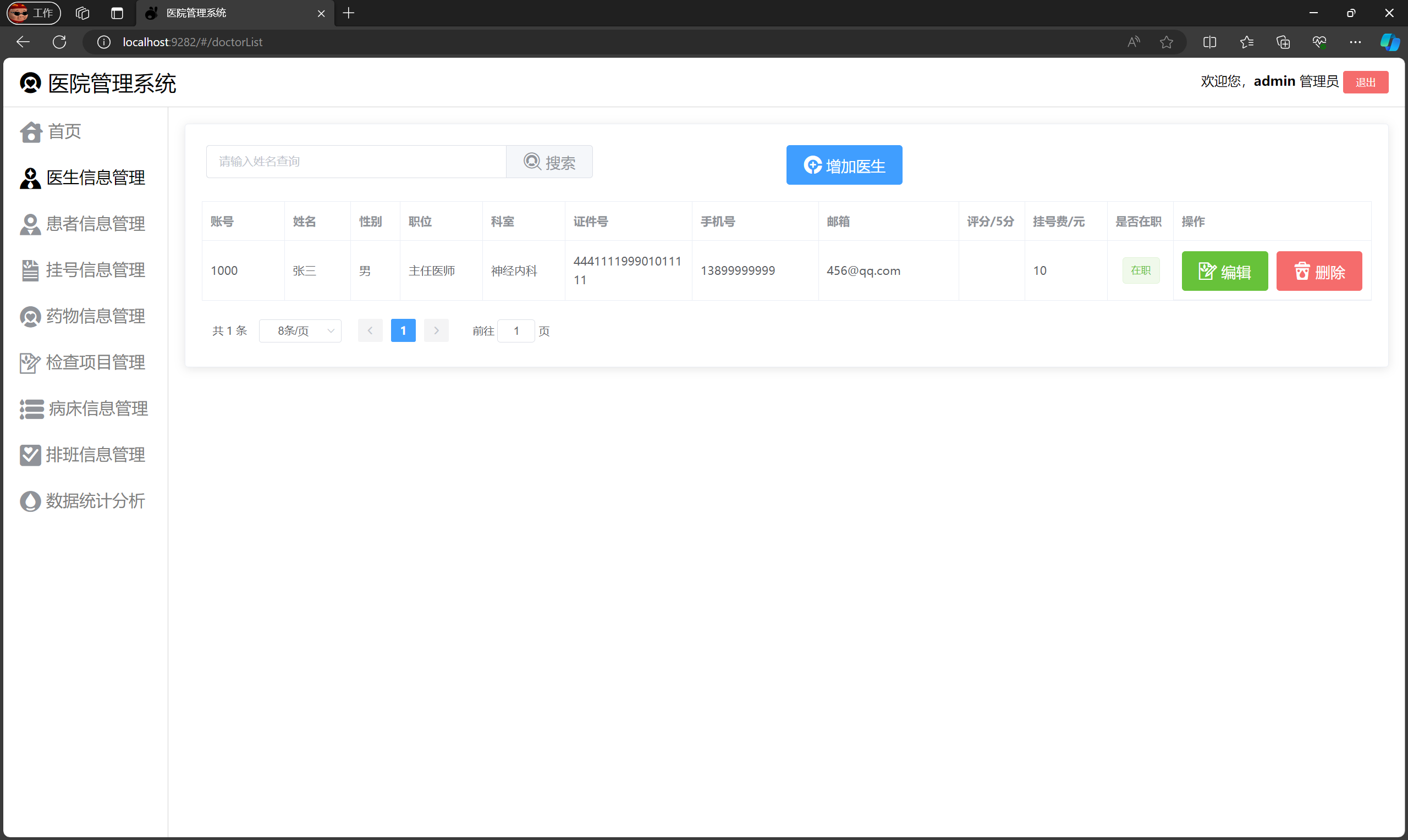 医生管理:可以分页模糊查询医生信息。支持编辑与删除功能。同时新增医生时,需绑定所在科室,方便后续的排版。