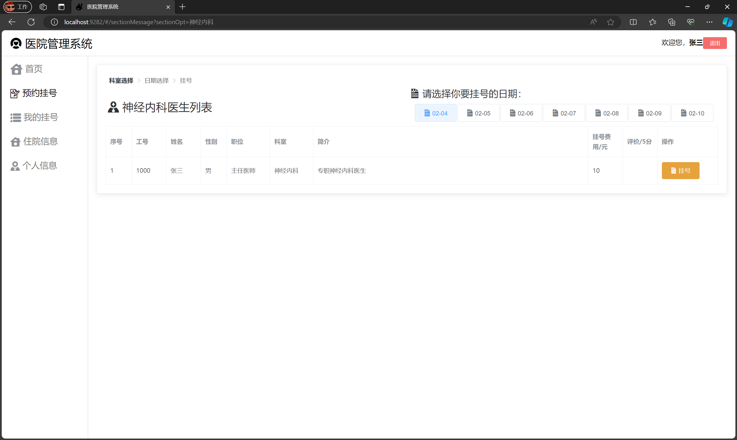 预约挂号:患者可以选择科室与日期来进行挂号。