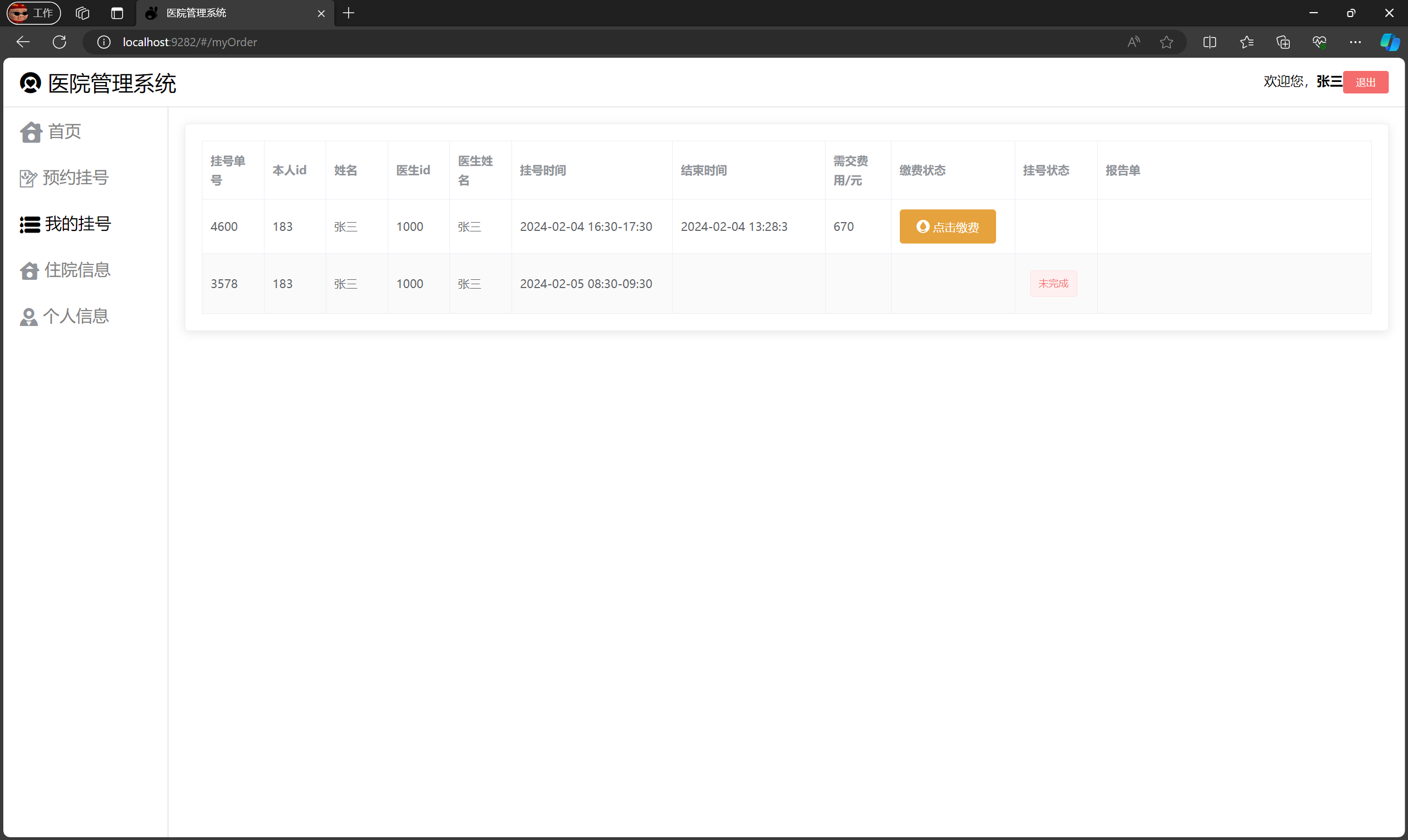 历史挂号列表:医生可查询历史挂号的信息。可以查看缴费状态与挂号状态。
