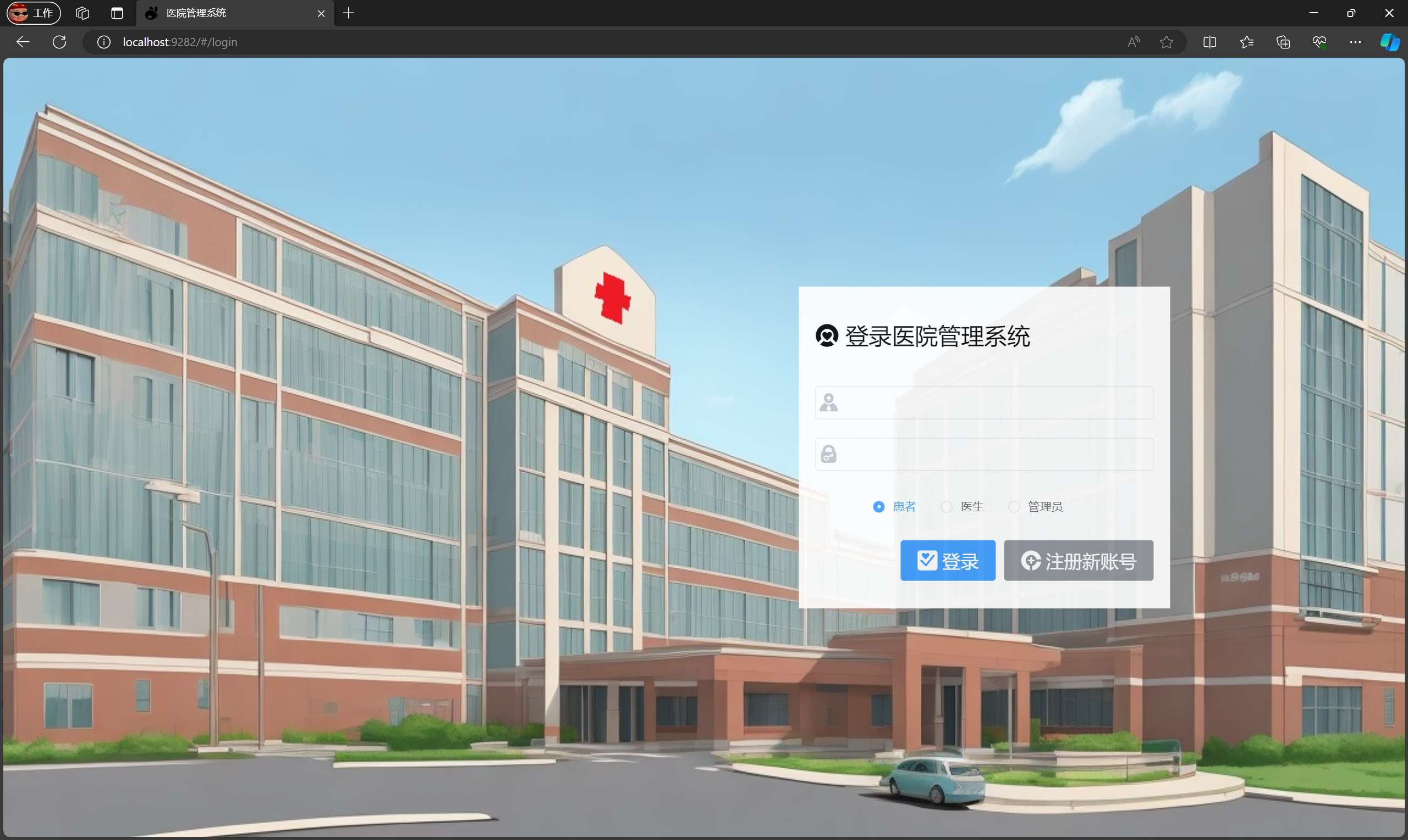 系统登录页面:分为三个角色登录患者、医生、管理员。同时支持患者注册账号。医生账号由管理员进行创建。