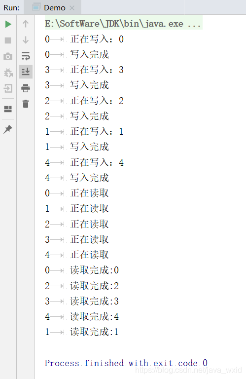 可以看到写的操作原子性和独占性没有得到保证,0线程正在写入共享资源的时候,其他线程有写入和读取的共享资源操作,导致数据不一致。