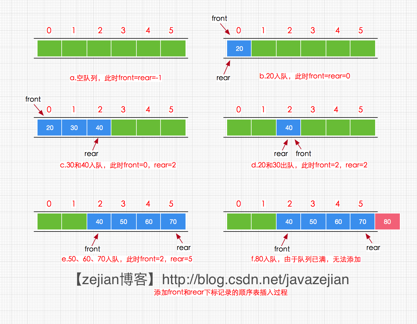 顺序循环队列就是将顺序队列设计为在逻辑结构上收尾相接的循环结构,这样我们就可以重复利用存储单元,其过程如下所示: