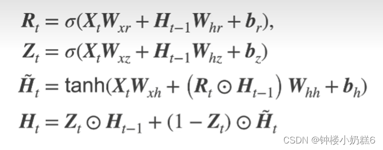 ①Rt是取值0~1的值,Rt越靠近0,Rt和H(t-1)按元素乘法得到的结果就越靠近0,相当于上一时刻的隐藏状态忘掉。