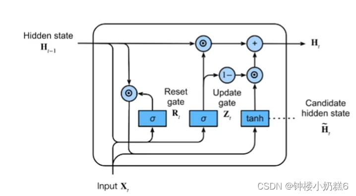 ③当Zt是1的时候,即Ht等于H(t-1)。相当于不使用此刻的输入xt更新隐藏状态。隐状态使用过去H(t-1),xt的信息忽略。