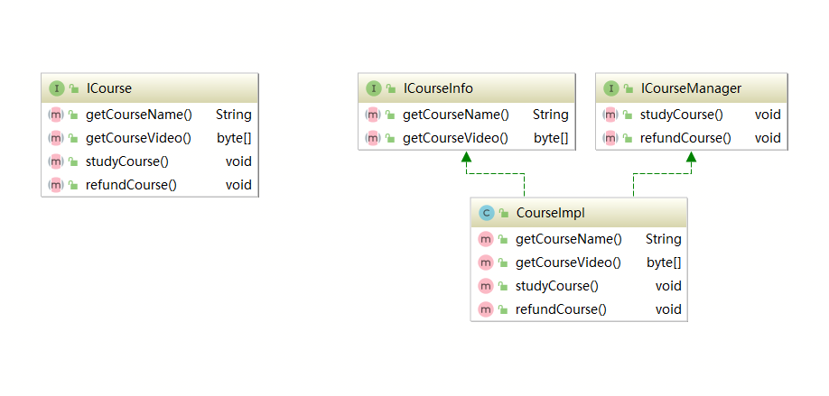 其实在控制课程层面上至少有两个职责。我们可以把展示职责和管理职责分离开来,都实现同一个抽象依赖。我们可以把这个接口拆成两个接口:ICourseInfo和ICourseManager。