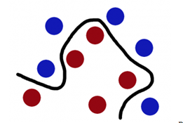 - 如下图想象红色和蓝色的球为球台上的桌球,我们首先目的是找到一条曲线将蓝色和红色的球分开,于是我们得到一条黑色的曲线。