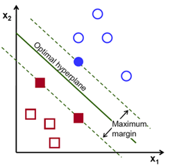 给定训练样本,支持向量机建立一个超平面作为决策曲面,使得正例和反例的隔离边界最大化。