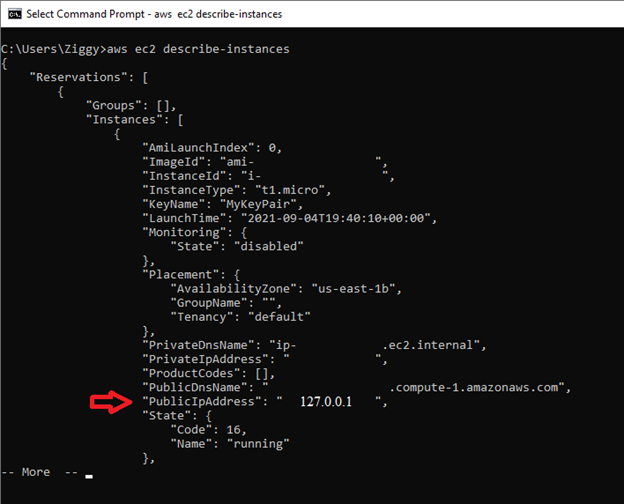 完成后,我们可以使用以下命令来验证我们的 EC2 实例的创建。请记下 PublicIpAddress 字段下的 IP 地址以备后用。