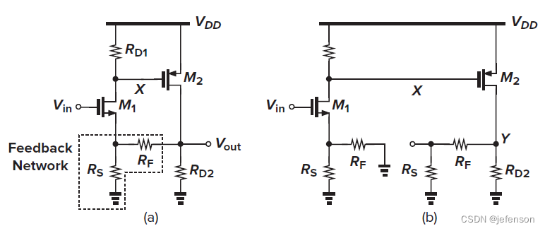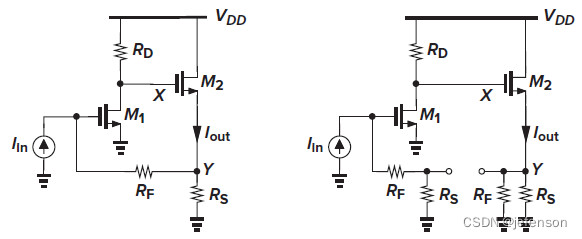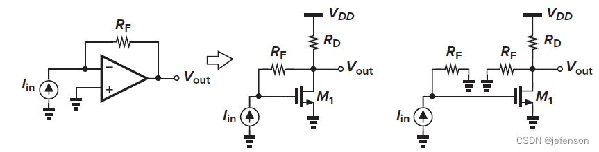 中图是典型的电压-电流负反馈放大电路,前馈网络通过反馈电阻和共源极放大电路,实现跨阻放大,反馈网络通过反馈电阻