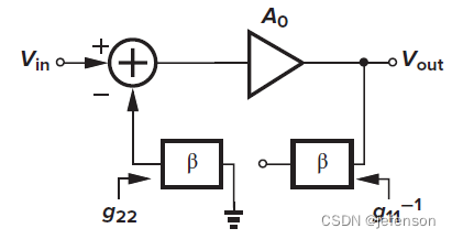 由于修正的开环增益符合输入输出的分压原则,通过修改原闭环电路,可以直接分析修正的开环增益,即将反馈网络同时纳入反馈输入端和反馈输出端,其中反馈输入端的反馈网络另一端需接地(),反馈输出端的反馈网络另一端需接地(