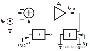 左图是典型的电流-电流负反馈放大电路,前馈网络通过反馈电阻、