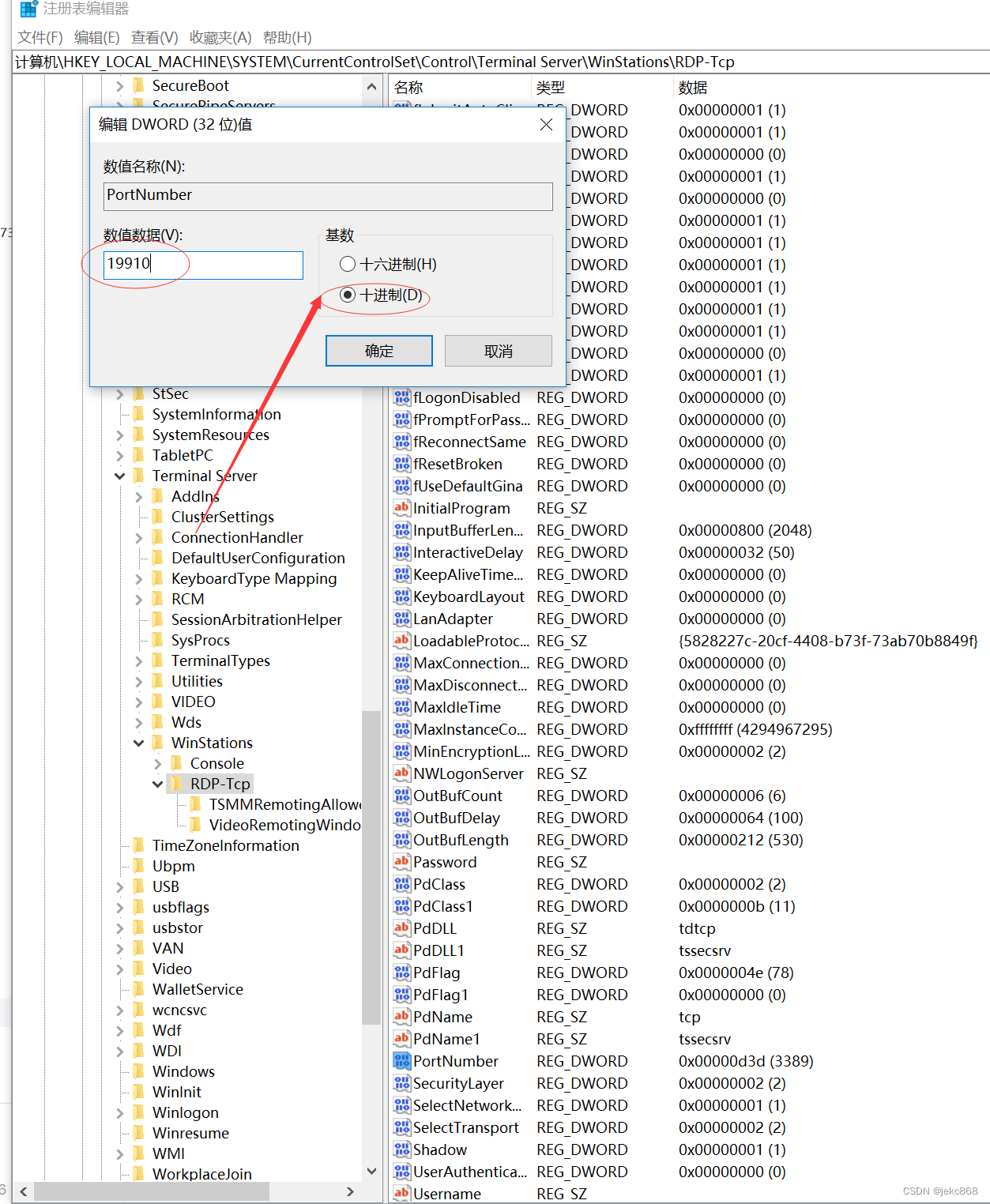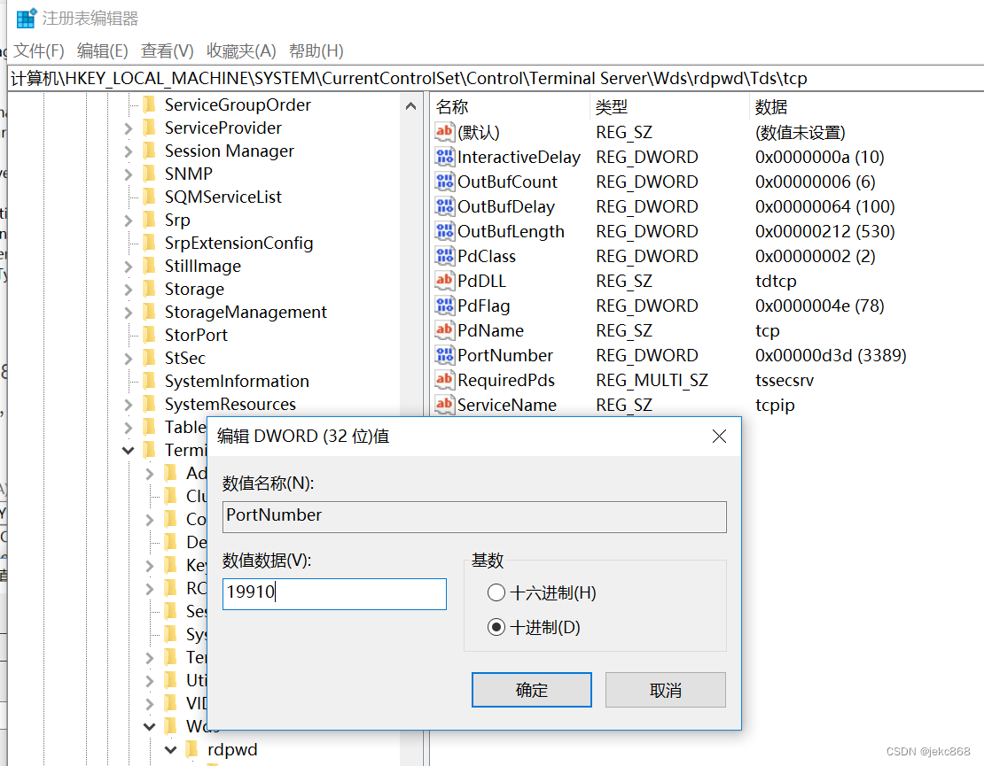 新的端口按自己需求设置,这里设置十进制数值数据:19910,点击确认