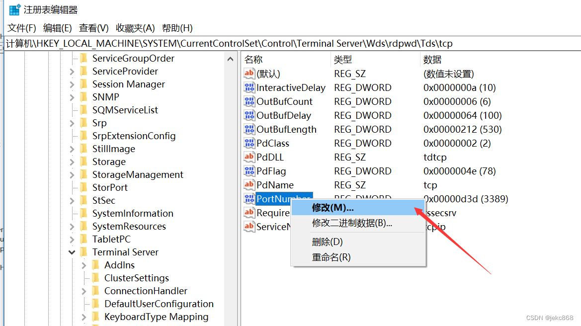 2、找到注册表需要修改配置端口的位置,共两处,修改第一处\Wds\rdpwd\Tds\tcp