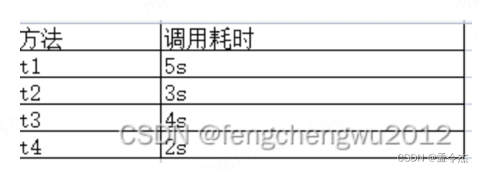 业务背景,在项目开发中,在一个方法中需要同时查询四个不同的远程接口,这个接口可以并行请求,但需要同时拿到四个接口返回的结果才能继续执行业务。很显然这种情况通过串行调用,肯定可以实现,但是这样会造成阻塞时间长,性能低。例如现在有四个方法及其调用时间: