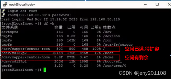 /dev/mapper/centos-root,容量50G,已用100%,而/dev/mapper/centos-home容量为3.6T,仅使用1%,考虑将/dev/mapper/centos-home分配部分空间给/dev/mapper/centos-root。