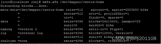 命令:mkfs.xfs /dev/mapper/centos-home # 创建/dev/mapper/centos-home文件系统