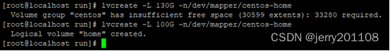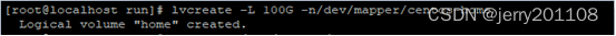 命令:lvcreate -L 100G -n/dev/mapper/centos-home # 重建/dev/mapper/centos-home逻辑卷,此处的100G,最好是填写原大小减去centos-root扩容的大小