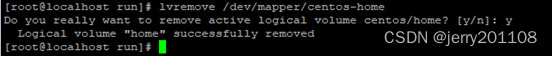 命令:lvremove /dev/mapper/centos-home # 删除/home目录对应的逻辑卷