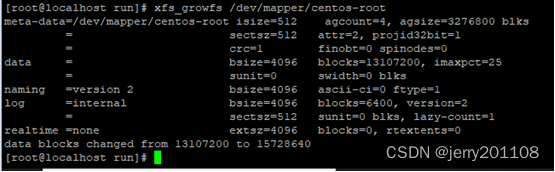 命令:xfs_growfs /dev/mapper/centos-root #扩大/dev/mapper/centos-root文件系统
