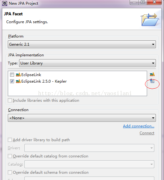 2.写好工程名字,点下一步,再下一步,如果第一次建JPA工程也许会卡在下面这个界面上,提示要选User library, 点击红圈处的下载,选择对应你Eclipse的那个,我的是kepler(启动eclipse时的界面上可以看到),勾选上,然后finish: