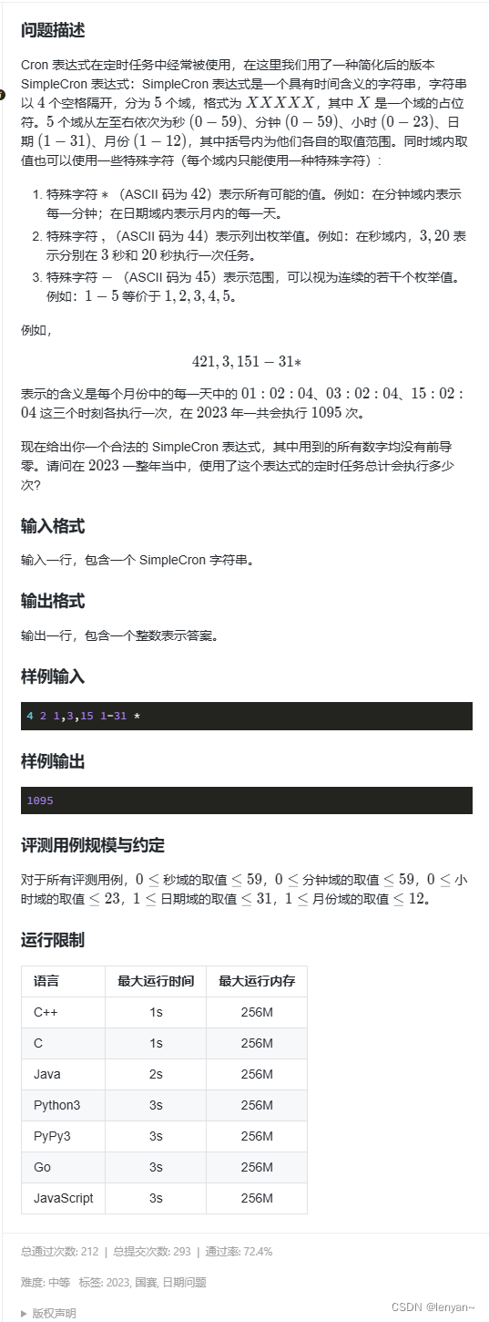 那么我们可以考虑两步走:先用时、分、秒计算出每天触发的次数;再计算一年总共会触发的天数,二者相乘即为答案。
