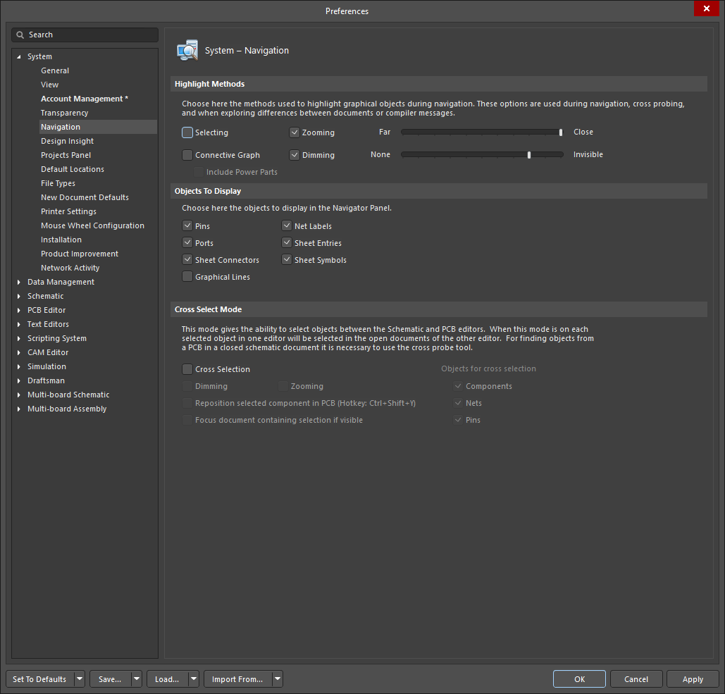 - Objects for cross selection -勾选用于支持交叉选择模式的对象,包含器件、网络、管脚,可以任意选择或全选。