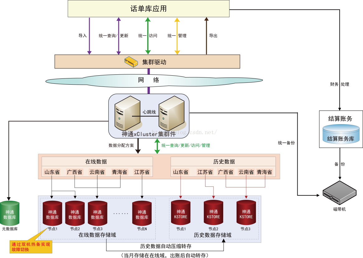 ■ 系统总共部署了84台刀片服务器,由2套神通xCluster、36套神通数据库和4套神通KSTORE组成的分布式集群数据库构成,共管理8个月网间结算和网内摊分数据和18个月ISP和CP厂商结算数据,总数据量近360TB,提供统一的查询、更新、删除、统计等数据服务,系统最大强并发数达1500。
