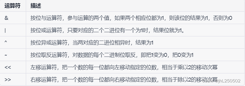 | 位运算符:&,|,^,~,<<,>> |