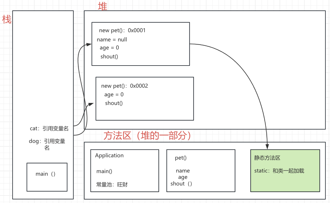 使用new关键字创建的时候,除了分配内存空间外,如果你没有给创建的对象赋值,他还会自动给创建好的对象进行默认初始化(比如String类型默认null),以及对类中构造器的调用。