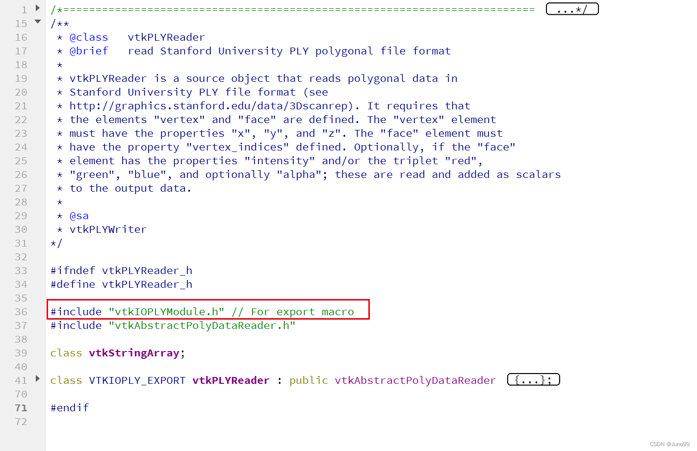 - 检查所需类或者函数所在的库是否已经导入,如果没有,找到库文件并将其导入进项目。以我项目中报错的vtkPLYReader为例,ctrl+左键进入到vtkPLYReader的头文件,可以看到该类所属库vtkIOPLY,然后在.pro文件中将这个库导入进来。