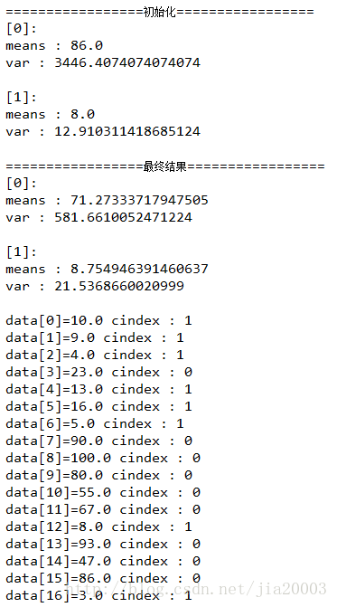 这里初始中心均值的方法我是通过随机数来实现,GMM算法运行结果跟初始化有很大关系,常见初始化中心点的方法是通过K-Means来计算出中心点。大家可以尝试修改代码基于K-Means初始化参数,我之所以选择随机参数初始,主要是为了省事!