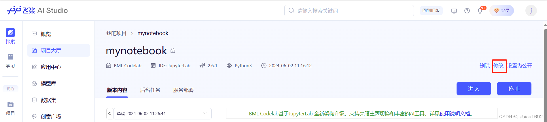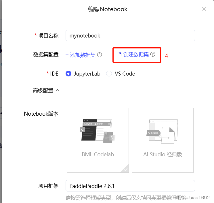 项目名称根据实际情况填写,此处选择JupyterLab,然后点击创建。