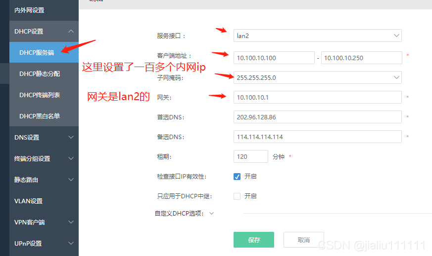 添加一个动态ip段供办公室电脑上网,这边选择lan2的网关