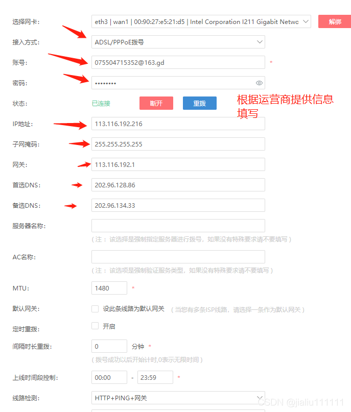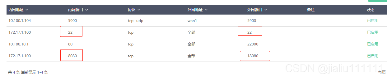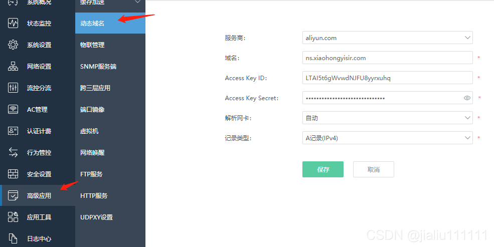 举例这里办公室装了一台centos服务器需要能外网访问,首先为服务器设置一个静态ip,将服务器的网卡号绑定到lan2网口,在到端口映射将服务器的22端口和8080映射到外部访问。高级应用里面有个一个动态域名,可以选择阿里云域名绑定解析,需要阿里云账号的key值