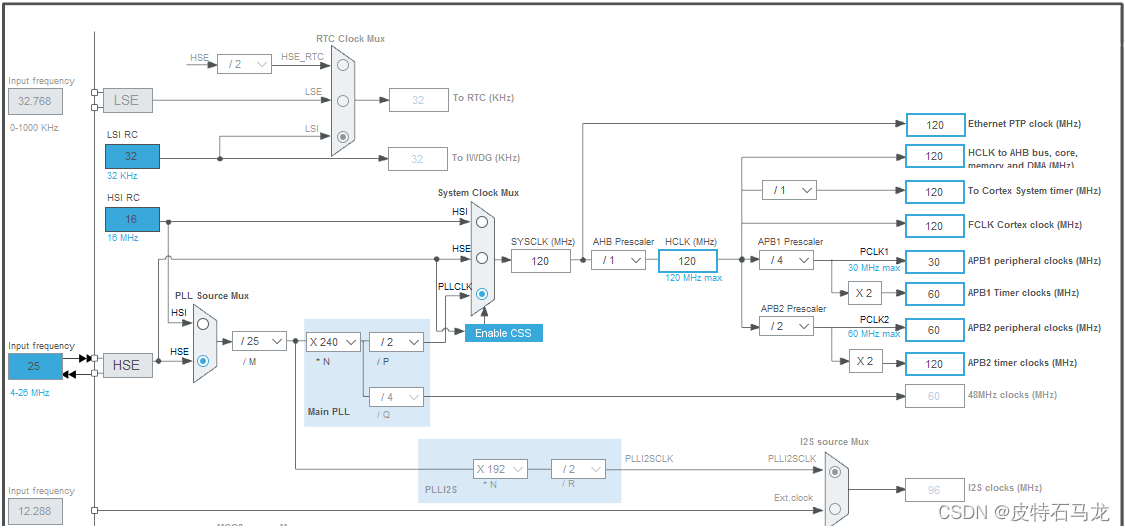 使用CubeMX 快速生成代码 ,系统时钟为 120Mhz。