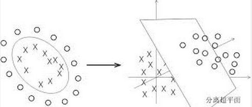 前面的算法是针对线性可分的情况,当我们的样本线性不可分的时候怎么办呢?如果我们可以把线性不可分的问题转变成线性可分的问题该有多好!生活就是这么的美妙,我们可以将样本通过一个映射函数把它从原始空间投射到一个更高维的特征空间,使得样本在这特征空间线性可分,如下图所示。