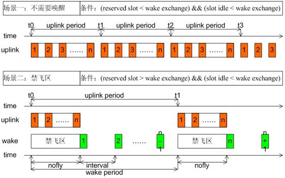 例:在一个无线通信系统中,节点定时上报数据给网关(如下图红色时隙),同时也支持网关唤醒节点(如下图绿色时隙),为此需要设计“唤醒算法”。要求: