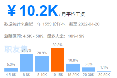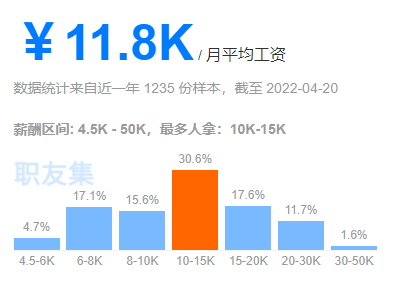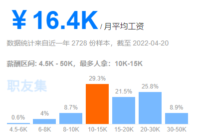 成都位于第六的位置,其中,10-15K薪资区间的人数占到了30.8%。