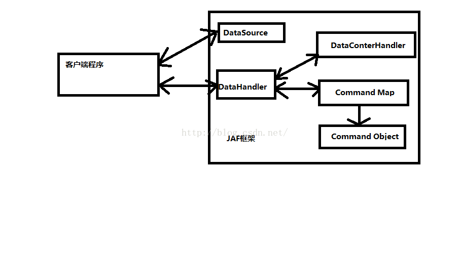 JAF为应用程序提供了一个通用的数据处理机制,对于采用JAF框架封装的数据,应用程序通过JAF框架提供的接口就可以获知数据的MIME类型,以及动态嵌入到JAF框架中的可处理该MIME 数据类型的所有可用操作。调用者访问这些操作时,JAF框架将自动构建用于完成当前操作的命令对象,并返回给调用者,调用者通过这个命令对象就可以对数据做特定的处理,下图展示了JAF 框架中的主要API ,以及他们之间的调用关系。