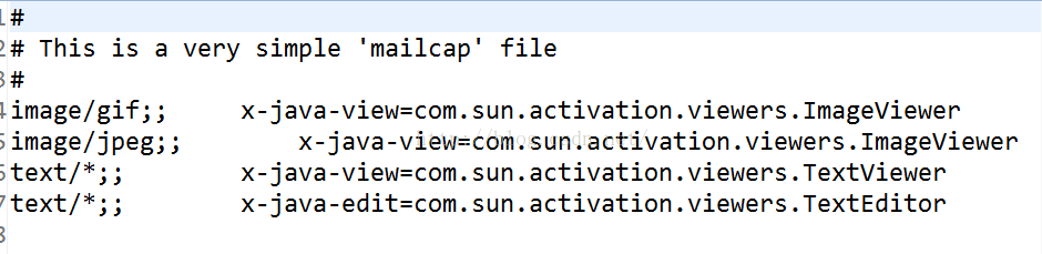 2.参照activation.jar文件中的mailcap.default文件,照猫画虎的编写一个自己的mailcap文件,其内容如下: