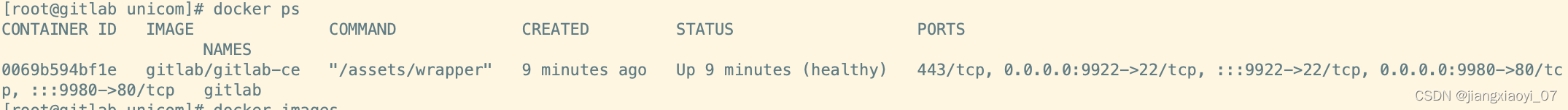 启动的容器名称为gitlab,系统重启后,容器将自动 restart,端口分别为9980和9922