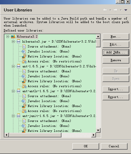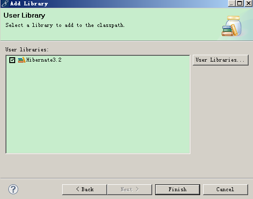 5.添加用户类库,选择自己建立类库,如下图。Finish 这样所有需要的jar包就会根据事先添加好的自定义类库一并添加的项目中去。