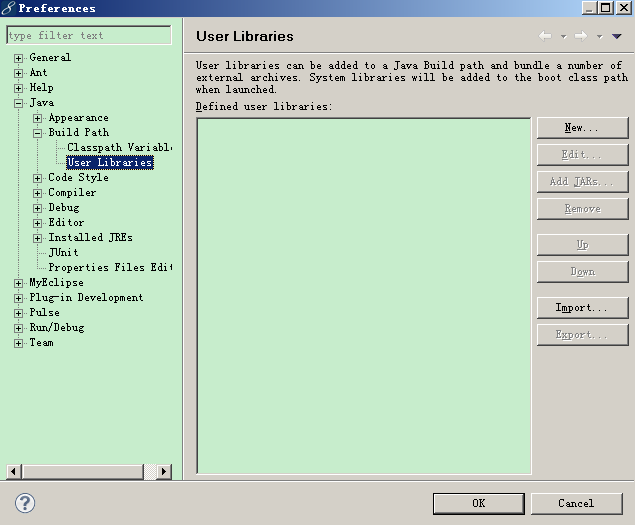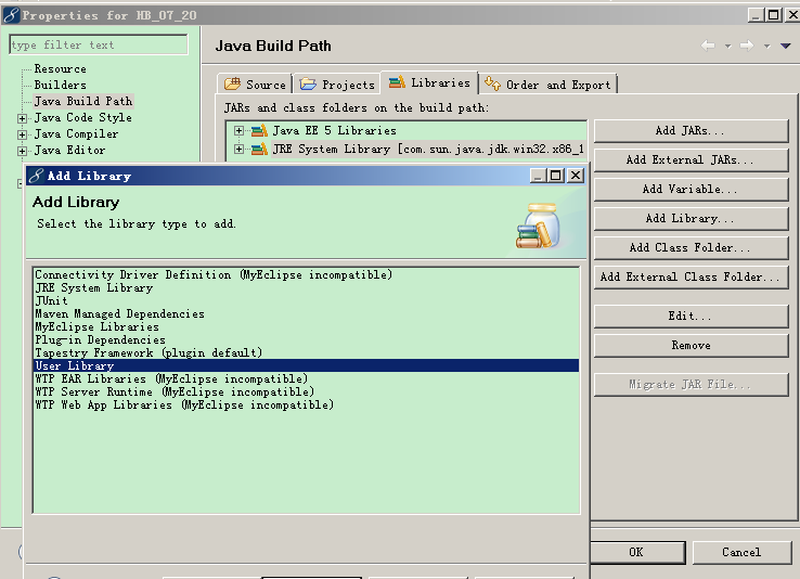 注:也可以通过工程名->右键->myeclipse->project capabilities引入自定义的类库,同时会自动生成相应的配置文件