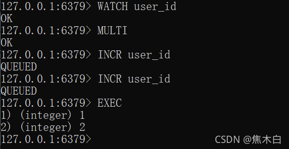 事务执行时必须以 MULTI 开始一个事务,然后将多个命令入队到事务中,最后由 EXEC 命令触发事务,一并执行事务中的所有命令。单个 Redis 命令的执行是原子性的,但 Redis 没有在事务上增加任何维持原子性的机制,所以 Redis 事务的执行并不是原子性的。其实,事务可以理解为一个大包的批量执行脚本,但批量指令并非原子化的操作,中间某条指令的失败并不会导致前面已执行指令的回滚,也不会造成后面未执行指令的停止。