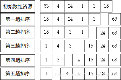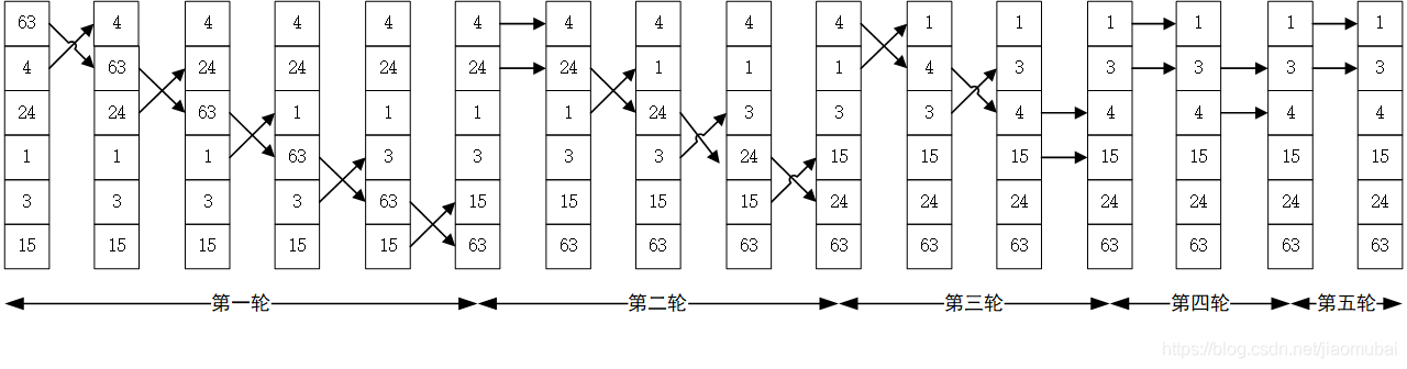 第一轮外层循环时把最大的元素63移动到了最后面,第二层循环便不再对最后一个元素63进行比较了,因为它已经被确认为最大的了,需要对比的是其他的剩余元素。于是第二轮比较将24移动到了63的前一个位置。其他循环将以此类推,继续完成排序任务。
