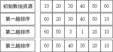 冒泡算法由双层循环实现,其中外层循环用于控制排序轮数,一般为待排序数组的长度减1,因为最后一次循环只剩下一个数组元素,不需要对比,同时数组已经完成排序了。内层循环主要用于对比数组中相邻元素的大小,以确定是否交换位置,对比和交换次数随排序轮数而减少。例如,一个拥有6个元素的数组,在排序过程中每一次循环的排序过程如下:
