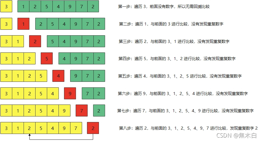 该字典结构的数据左边的 key 代表整数的值,右边的 value 代表整数出现的次数。当遍历到最后一个整数 2 时,发现 2 在字典中已经出现过,那么就证明该数列中重复的数字是 2。